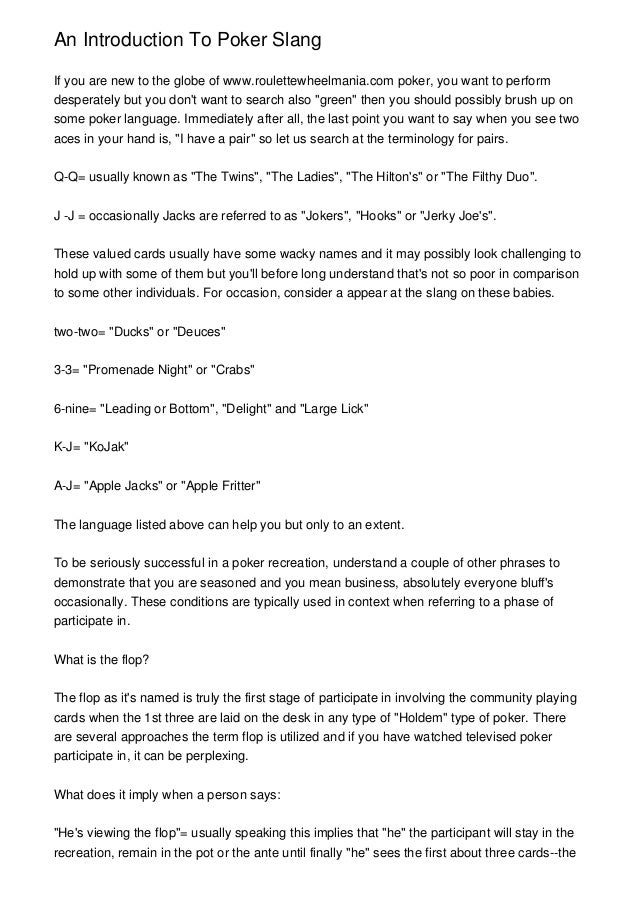 - Poker Slang Terms. Poker is a fascinating game which almost seems to have it’s own language. If you spend any time in a poker room, you’ll hear dozens of phrases and terms with no idea what people are on about. In this article, we will provide an A to Z on the most common poker slang terms.